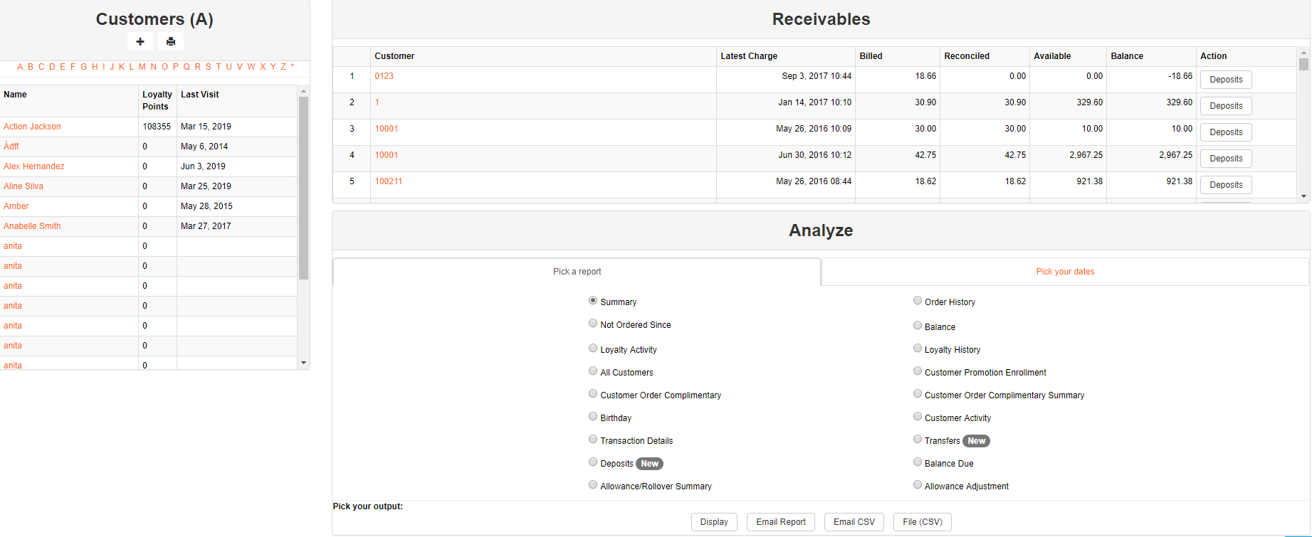 Similar to Deposits, the Receivables feature allows users to track data related with billed accounts. At a glance a user can see the customer name, the latest charge, the amount billed, the amount reconciled, the amount available in their account, and finally their outstanding balance. To the far right the user can select the “deposits” button and they will be redirected to the deposits section. This allows users the ease of searching for customer accounts and tracking deposits for the specific customers. If a store is interested in using the Bill feature to keep track of customer account balances and receivables, they can request that by way of the Manager on Duty.